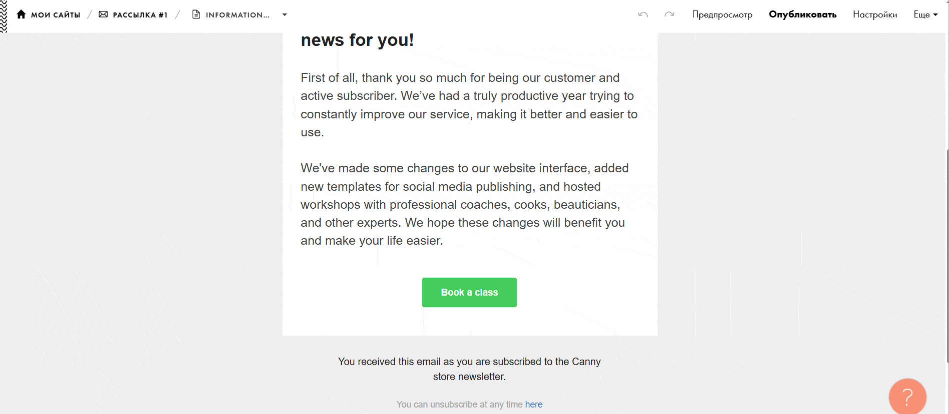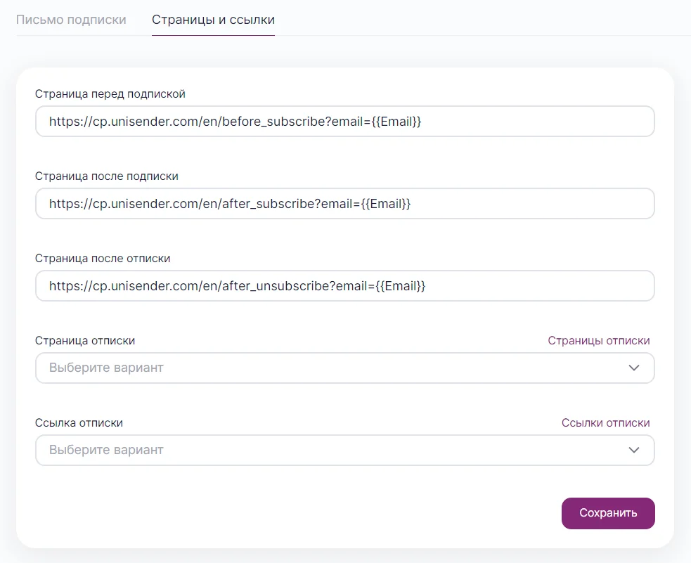 Здесь уже указать тему письма и отправителя, а также страницу и ссылку для отписки — на тот случай, если подписчик не захочет больше получать рассылку.