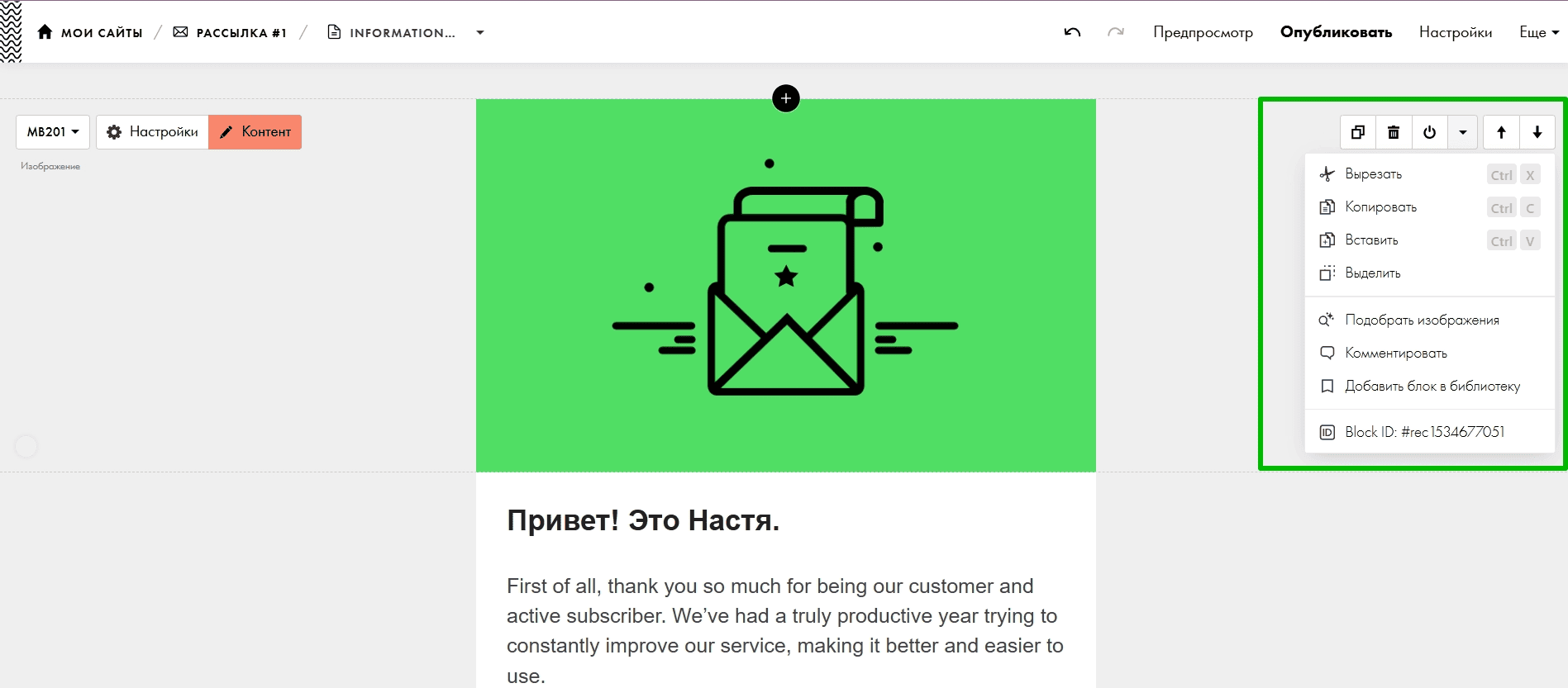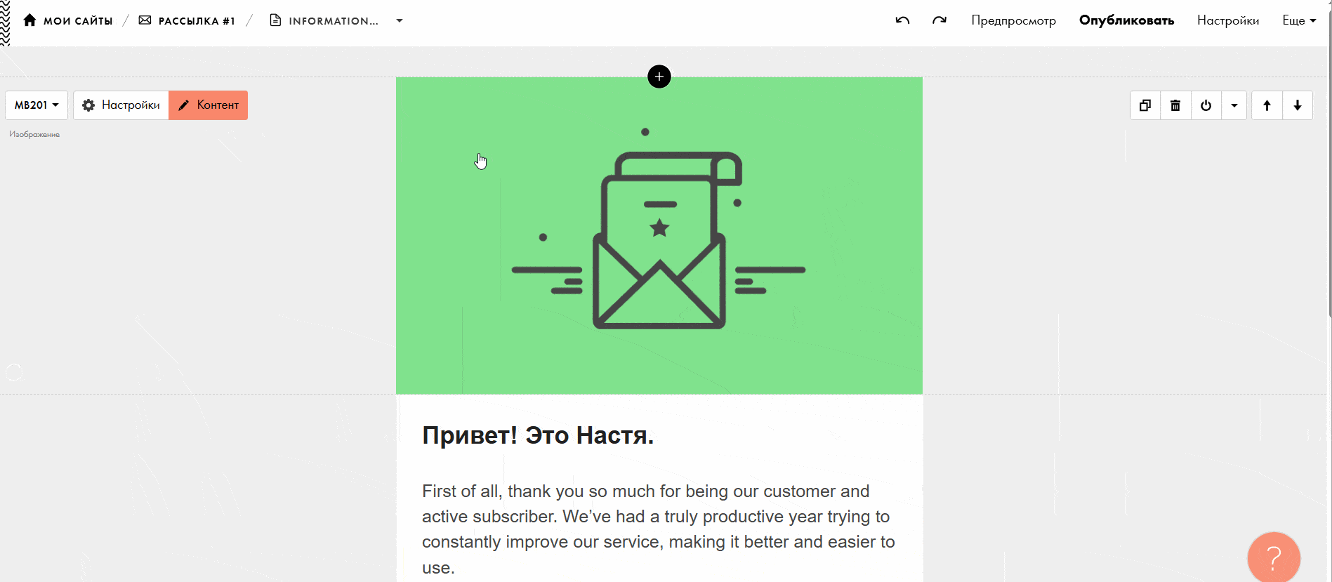 Чтобы поменять текст шаблона или изображение, кликните на них и добавьте собственный контент. Также можно использовать меню «Контент» слева от выбранного блока.