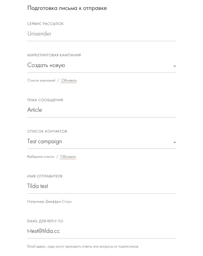 Если всё настроено и работает, в Tilda можно запустить первую рассылку. Сначала нужно создать рассылку — как это сделать, мы рассказали в начале статьи. Затем: