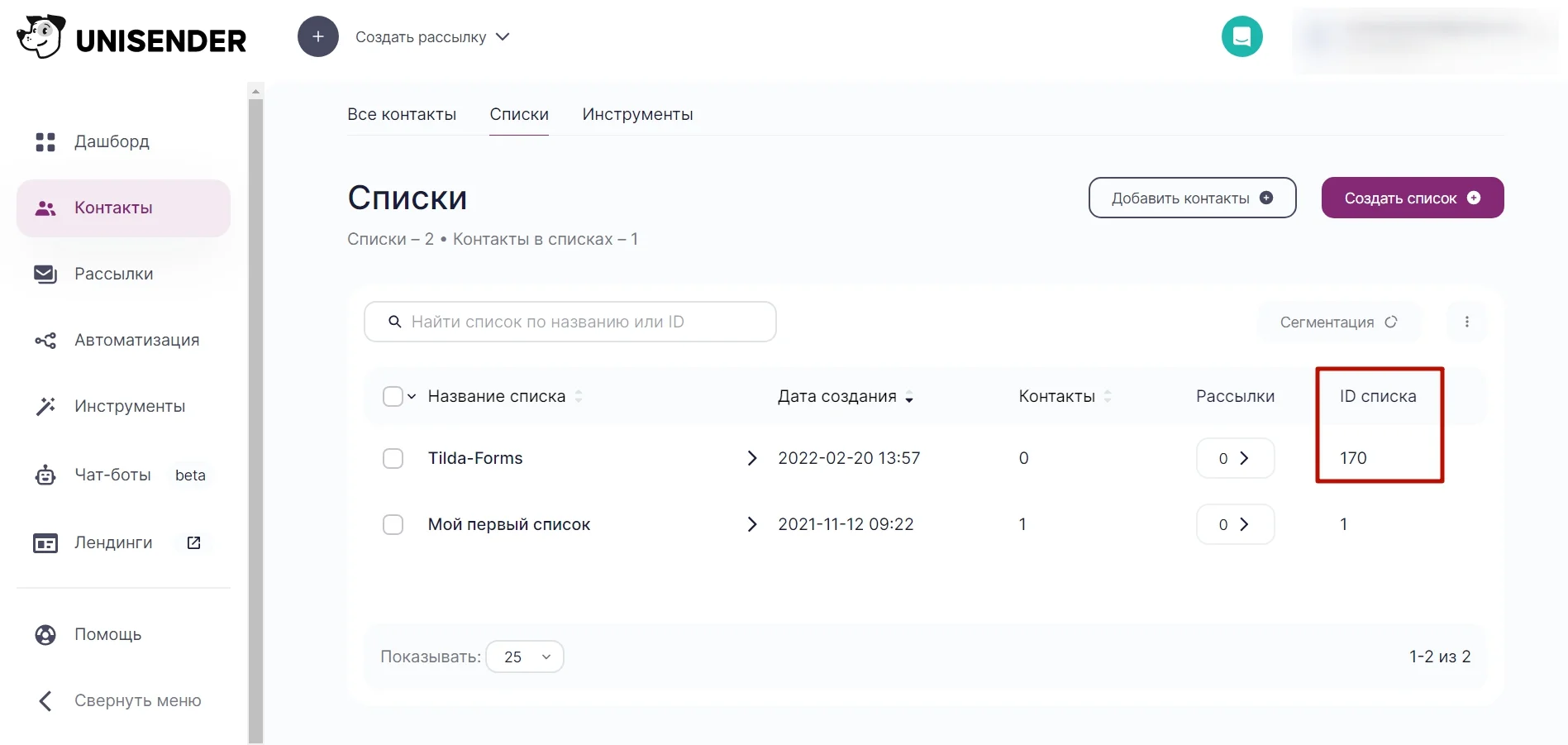 Сначала нужно зарегистрироваться в сервисе, если ещё не. Потом выбрать «Контакты → Списки → Создать список». В правом столбце будет ID — он нужен для настройки интеграции в Tilda.