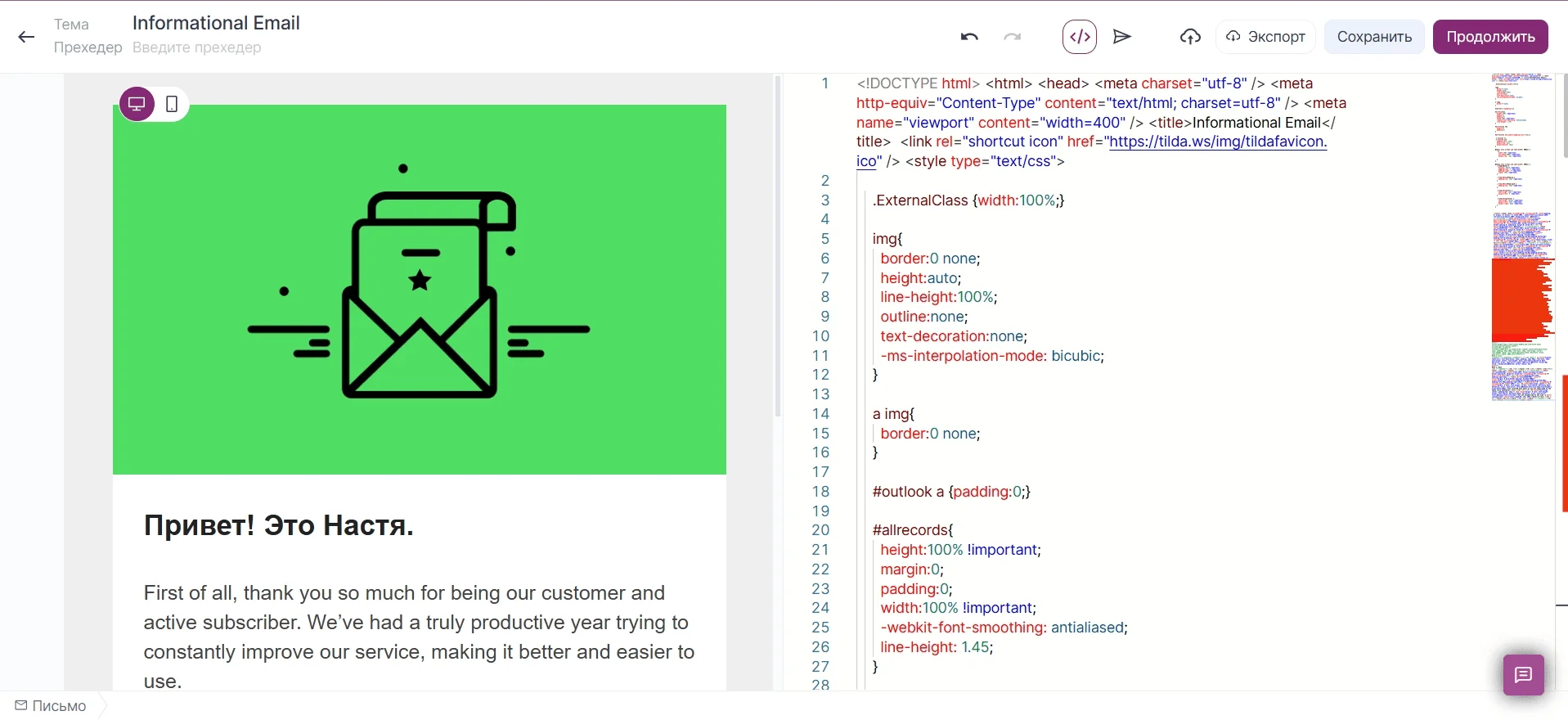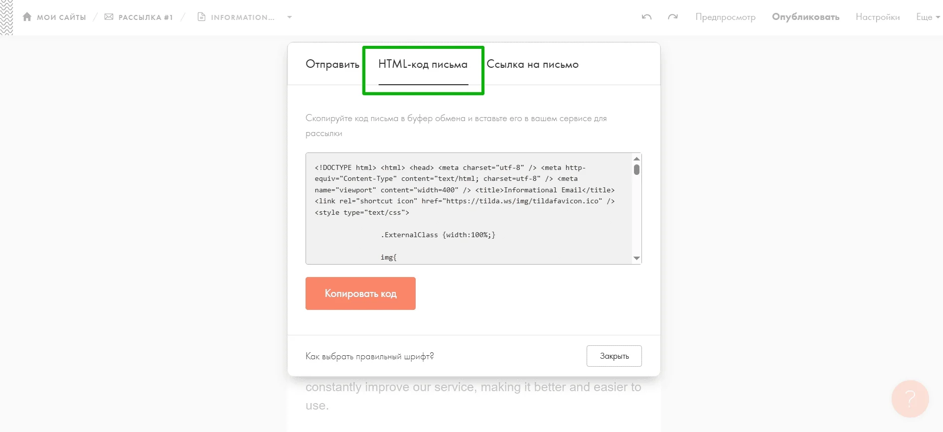Чтобы получить дизайн письма для загрузки в ваш почтовый сервис, зайдите в раздел «Опубликовать» и перейдите во вкладку «HTML-код письма».