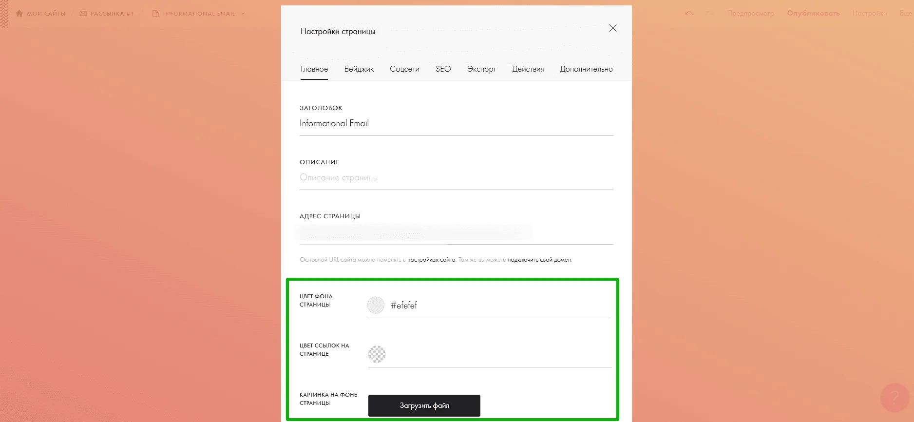 Фон можно менять у всего письма: использовать галерею цветов или загрузить фоновое изображение. Для этого перейдите в раздел «Настройки» в левой верхней части экрана редактора.