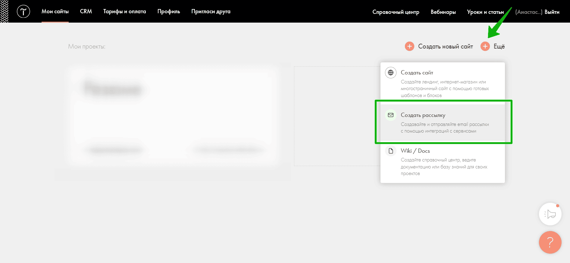 Редактор писем Tilda доступен только на платных тарифах, но его можно использовать бесплатно 2 недели — как на вновь созданных аккаунтах, так и на уже существующих, если до этого триал не был подключен. Чтобы перейти к конструктору писем, достаточно открыть раздел «Мои сайты», выбрать «Ещё» и в раскрывшемся меню — «Создать рассылку».