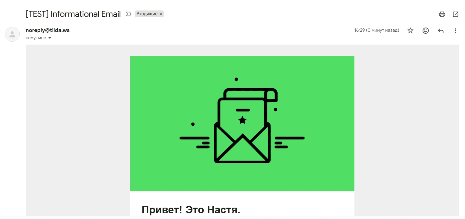 На почтовый ящик письмо уходит мгновенно, однако часто попадает в папку «Спам». Перед заголовком письма большими буквами указывается [TEST].