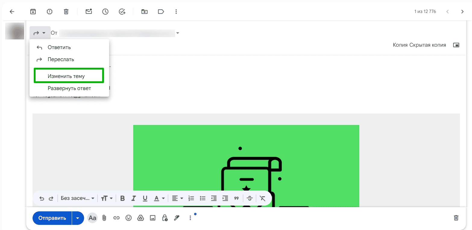 После этого нажимаем «Переслать письмо» и удаляем все следы пересылки. Нужно не только стереть часть содержимого с первоначальными данными, но также нажать на стрелку возле поля «Кому» и выбрать «Изменить тему» — только после этого можно будет избавиться от приписки [TEST].