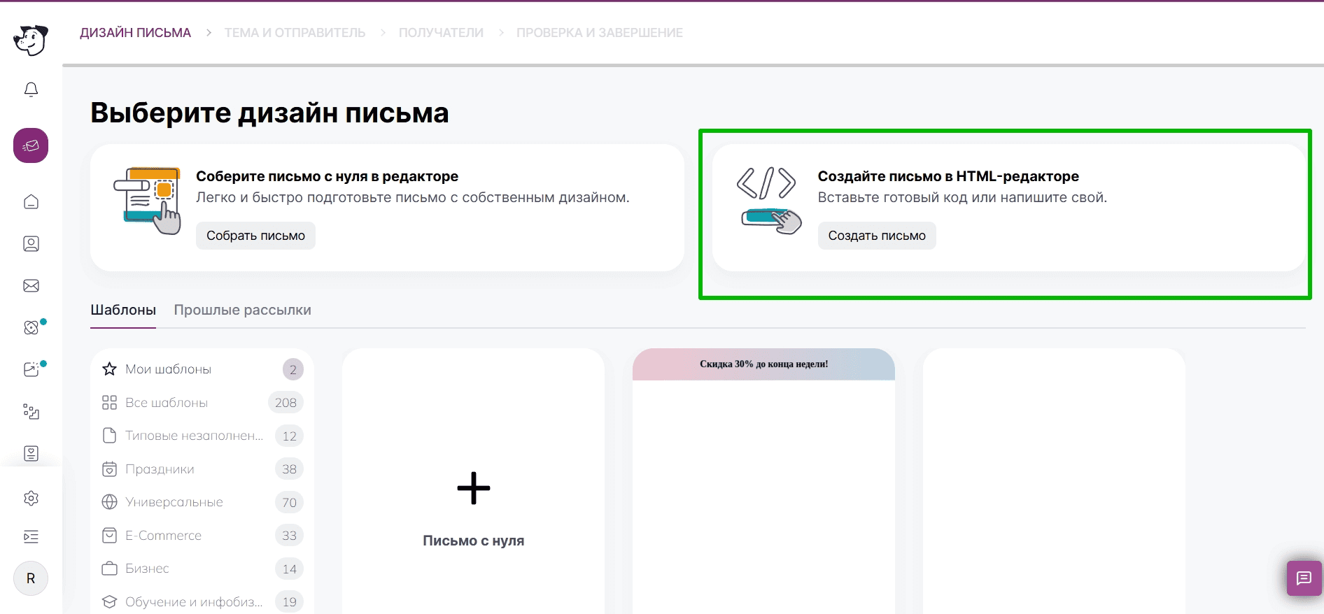 Скопируйте сгенерированный код и перейдите в сервис рассылки. Функция импорта HTML-кода есть во всех сервисах для отправки писем. Например, в Unisender нажмите на кнопку «Создать рассылку». Сервис предложит загрузить собственный HTML-код: