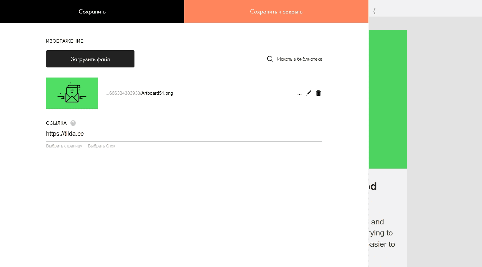 Изображение можно перетащить из папки на компьютере, вставить ссылку или выбрать по кнопке «Загрузить файл». Картинки удобнее менять через меню кнопки «Контент», так как если на картинке стоит ссылка, то вам сначала будет открываться она, и только после — окно для загрузки.