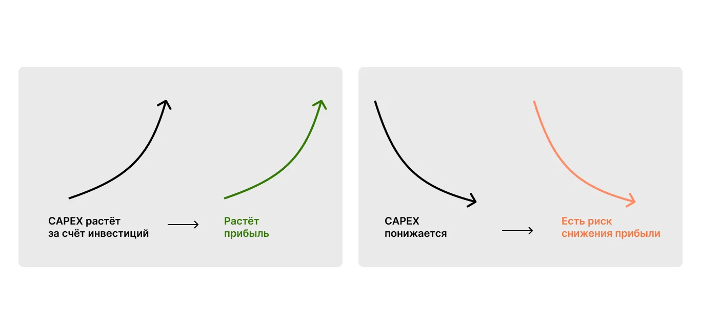Если CAPEX растет, например, покупаются активы и они приносят больше денег, компания получает больше прибыли. Если CAPEX снижается, например, машины устаревают и требуют замены, тогда может снизиться прибыль, потому что нужно покупать новые.