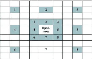 Как проводить. Нарисуйте схему из девяти квадратов 3х3 см². В центральный квадрат запишите основную проблему или цель. В восемь окружающих квадратов внесите направления, связанные с центральной темой.