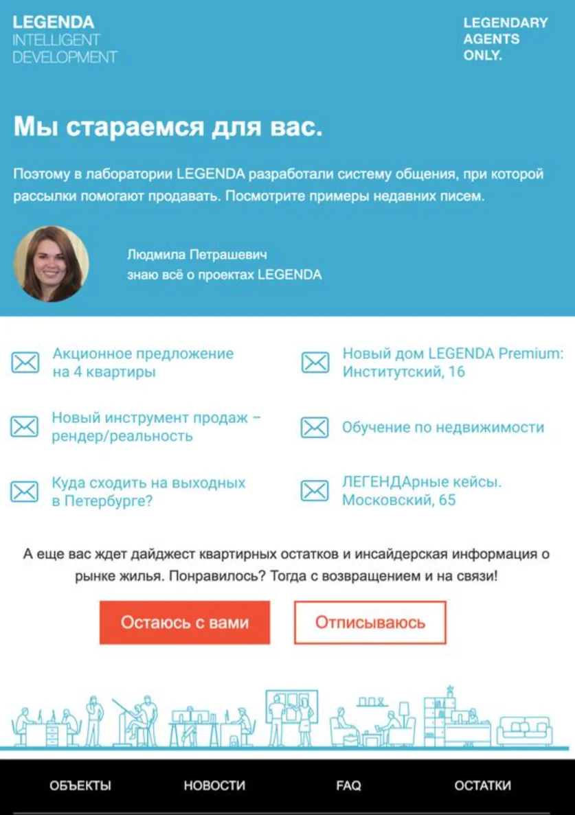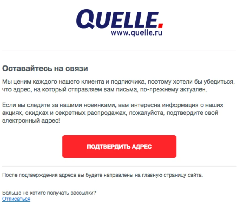 Например, если все контакты собраны с двойным подтверждением, то реанимацией можно считать открытие письма. Если вы не уверены в релевантности базы, то можно провести опрос, рассказать о содержании рассылки и предложить кликнуть на подходящую кнопку — «Получать рассылку» или «Отказаться». Если же не все адреса подтверждены, то для реанимации можно предлагать пользователям переподписаться.
