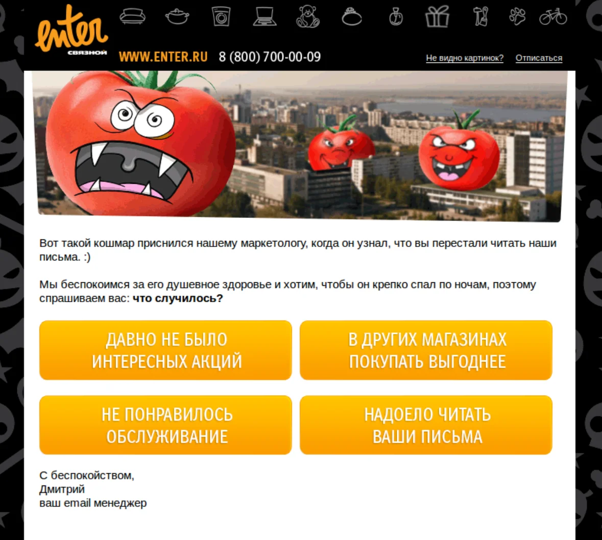 Если пользователь открыл и прочитал первое письмо, то реанимацию можно считать случившейся. Но для большей уверенности лучше спросить адресата, хочет ли он получать сообщения. Попросите кликнуть на кнопку, подтверждающую согласие или несогласие. Или сформируйте кнопки с возможными причинами отказа от рассылки — вероятность того, что пользователь напишет вам развёрнутый ответ, небольшая, а клик получить гораздо проще.