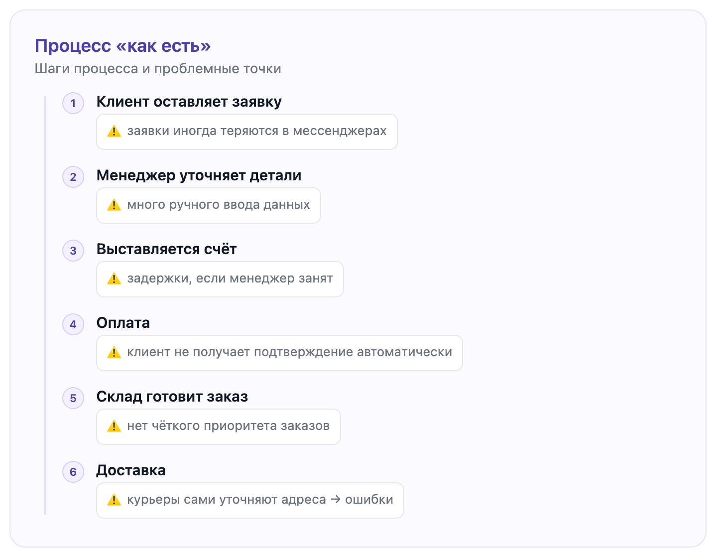 Опишите процессы как есть, без идеализации. Нужно понять, как реально выполняется работа: какие шаги идут подряд, кто кому передает информацию, где возникают проблемы.