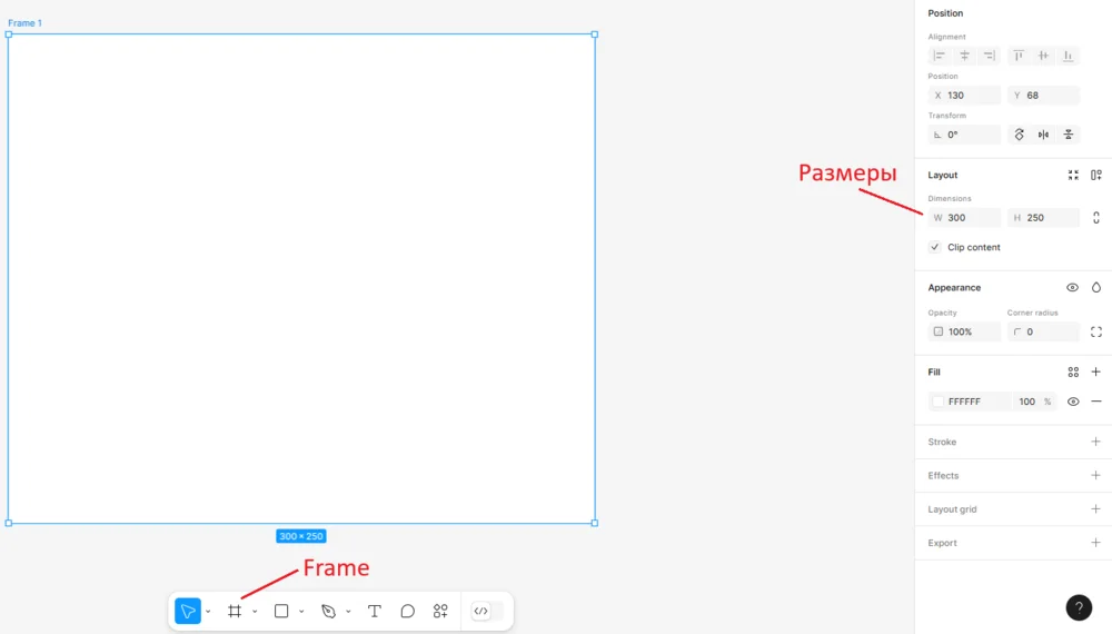 Сначала добавляем Frame — это рабочее поле, которое объединит остальные элементы. Для этого нажимаем на решетку на нижней панели и растягиваем рамку в средней части экрана. Нужную ширину и высоту можно настроить на панели справа в разделе Layout. Установим один из стандартных размеров баннеров — 300х250.