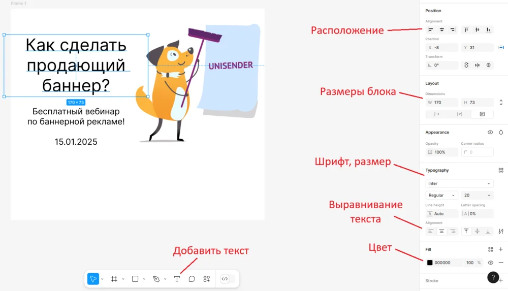 Дальше можно настроить расположение внутри рамки, размеры блока (ширина, высота), шрифт, начертание и размер букв, выравнивание текста и цвет. В нашем примере — стандартный шрифт Inter Regular, размеры — 20 и 10 пт, выравнивание по центру.