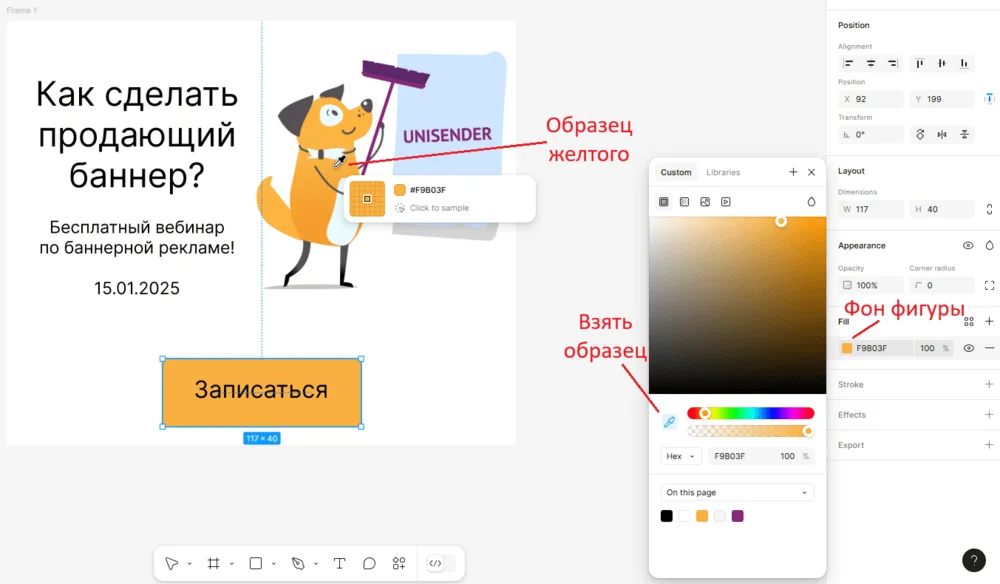 И зададим фигуре фирменный желтый цвет, чтобы призыв к действию выделялся ярче. В разделе Fill в меню слева нажимаем на квадрат, который обозначает фон фигуры. В открывшемся окне нажимаем на пипетку. Наводим ее на собаку, кликаем и забираем образец желтого цвета для кнопки.