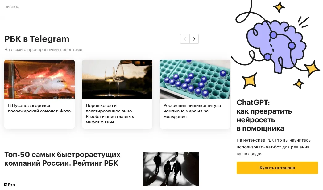 Вертикальный баннер с продажей интенсива по ChatGPT на сайте РБК.