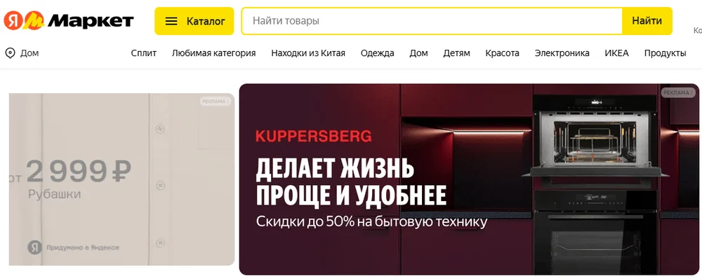 Реклама бренда Kuppersberg на главной странице Яндекс Маркета. Раскрывает преимущества компании и содержит выгодное предложение — скидки до 50%.