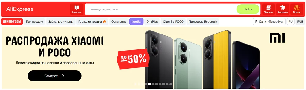На главной странице AliExpress размещен слайдер с подборками товаров. На скрине — распродажа смартфонов. Есть все базовые элементы: изображения товаров, указание скидки и кнопка с CTA.