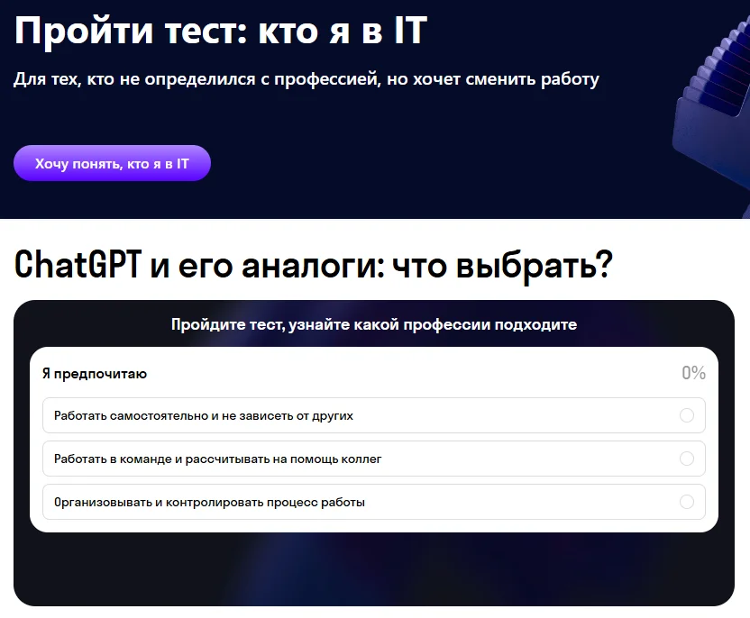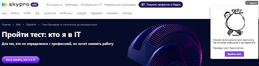 Баннер с тестом от онлайн-школы Skypro. Пользователю предлагают ответить на вопросы, чтобы узнать, какая профессия ему подходит. Сама картинка статичная, но интерактивная: при клике появляется попап с тестовыми вопросами. Для получения результатов нужно оставить контактные данные. В качестве бонуса платформа предлагает карьерную консультацию и скидку на обучение.