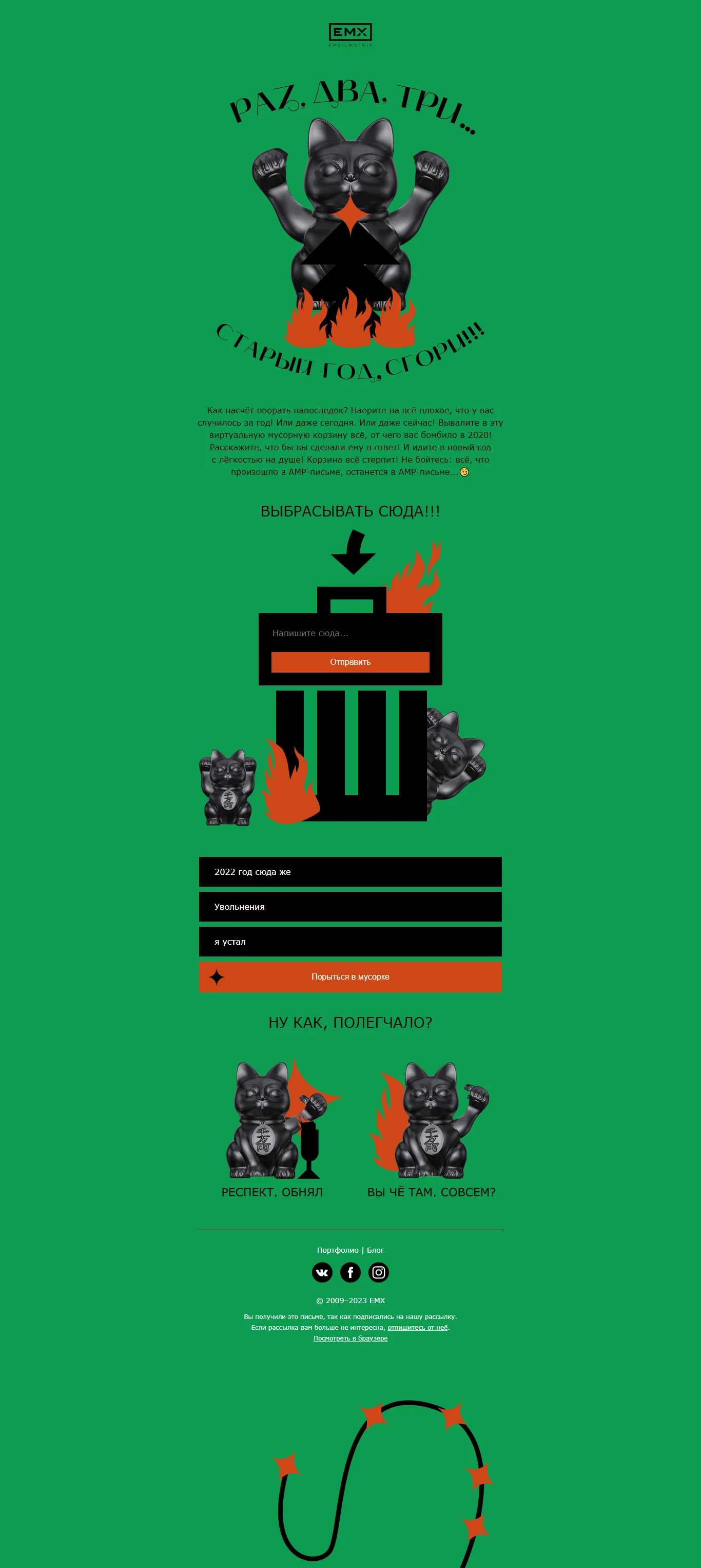 Манэки-нэко передает настроение письма с первого экрана, злобно взмахивая лапками. Цветовую палитру подобрали с учетом новогодней и одновременно горящей тематики.
