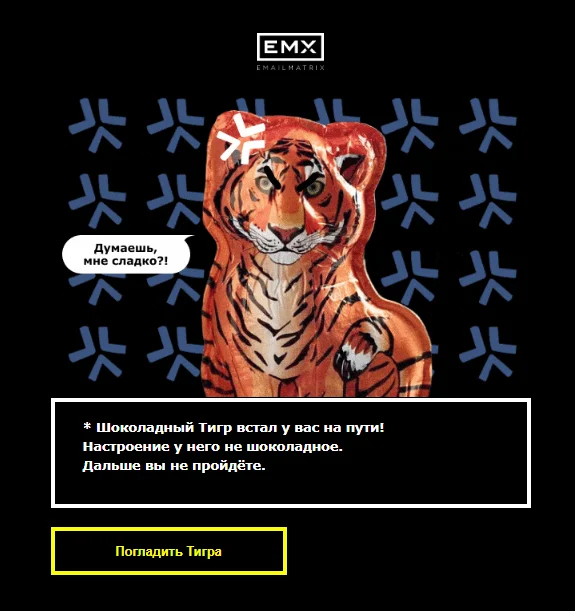 Результаты. Нашей основной задачей было просто сделать классное письмо и порадовать подписчиков. А в итоге мы получили конверсию в игру 35,6%, пожелания Тигру от 66% ее участников и добровольный шеринг письма.