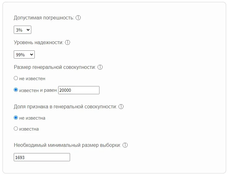 Рассчитать количество участников выборки помогут специальные сервисы. Например, Socioline или QuestionStar. Чтобы результаты были достоверными, устанавливайте погрешность не более 1–5%, а коэффициент степени доверия — 95–99%.