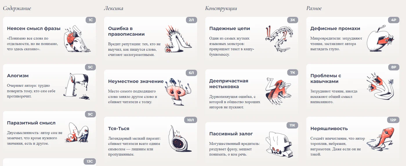 Ошибкариум — кладезь советов, как сделать текст лучше. На сайте четыре раздела с популярными ошибками авторов: содержание, лексика, конструкции, разное. В них советы, как улучшить текст в каждом аспекте.