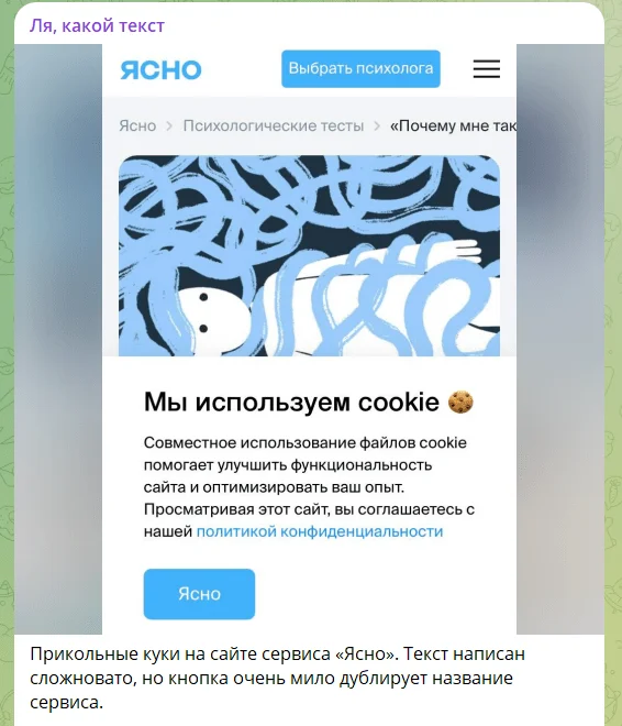 Telegram-канал «Ля, какой текст» — смесь полезного и развлекательного контента. Блог ведет коммерческий редактор Татьяна Швецова. В канале публикуются примеры цепляющих и не очень текстов. Некоторые посты публикуются в шуточной форме. Особо интересные случаи автор канала разбирает и дает свои комментарии.