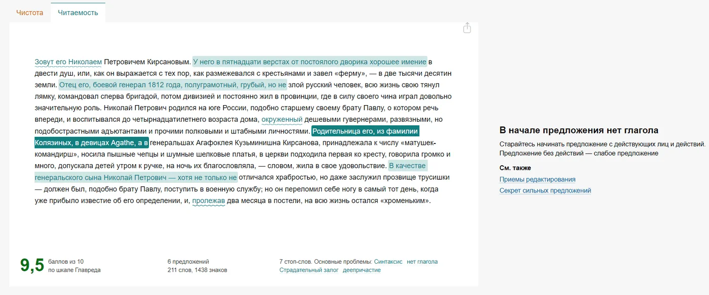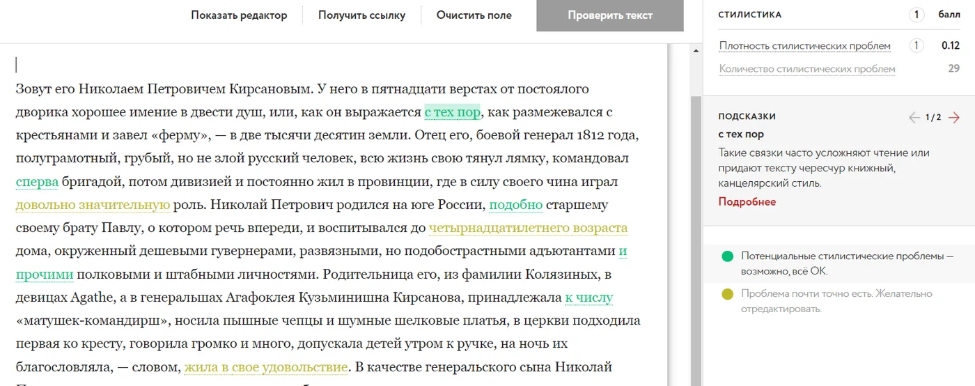 Один из сервисов Максима Ильяхова позволяет оценить чистоту и читаемость текста. После проверки ресурс выставляет оценку — N-ное количество баллов из 10 возможных, а также подсвечивает слова, которые следует убрать или заменить, чтобы сделать текст чище и понятнее. При наведении на слово сбоку появляется объяснение ошибки и совет, как ее исправить.