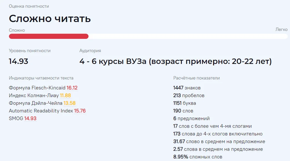 Сервис «Простым языком» оценивает текст по шкале от сложного до легкого. В цифрах указывается уровень понятности, количество сложных слов. Также подбирается аудитория, для которой текст максимально подходит.