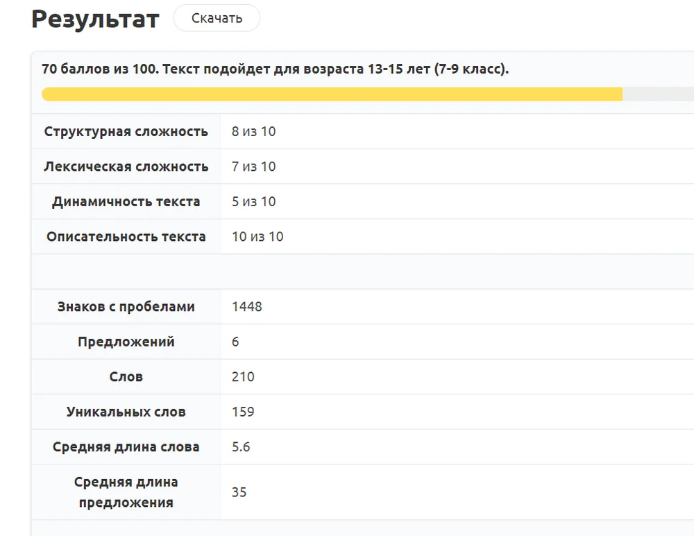 Проверка для носителей языка показывает, для какого возраста и образования подходит текст, а также насколько он сложный по нескольким показателям. Для иностранцев ресурс выдает уровень владения языком, анализирует сложность текста по различным шкалам.