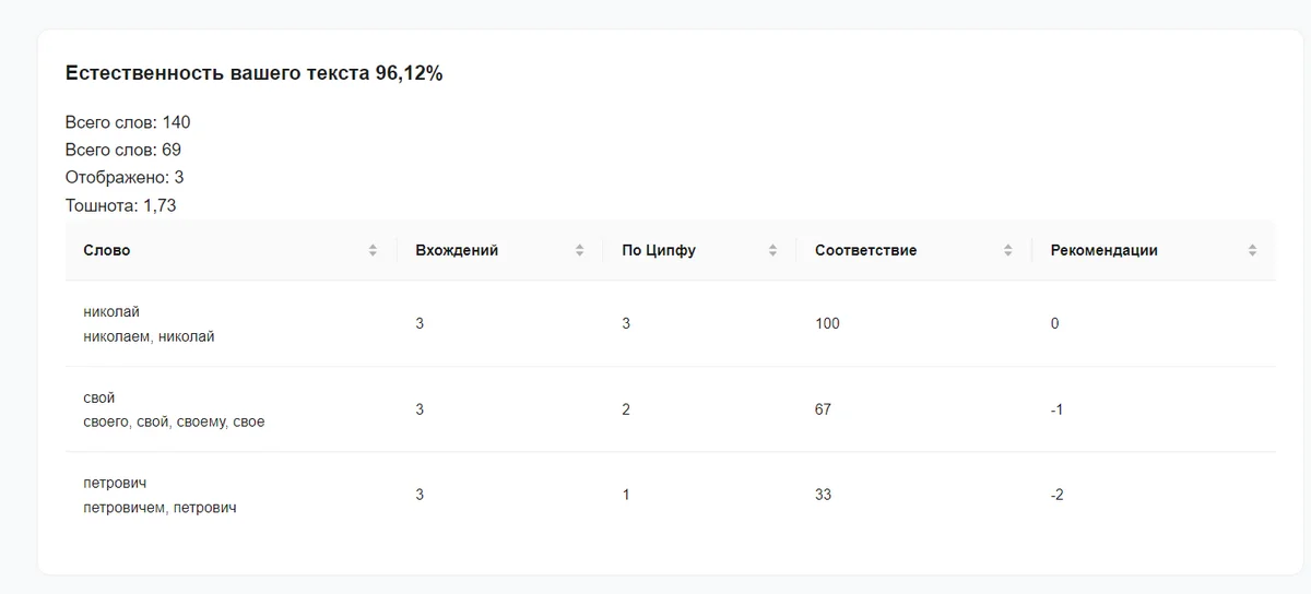 Ресурс оценивает читаемость текста по закону Ципфа, который основан на распространенности слов в языке. Проверка текста по закону Ципфа показывает, как часто в нем использованы разные слова — оценивается тошнота текста. Для высокой оценки текста ключевые слова нужно использовать умеренно, а слова, которые не несут смысловой нагрузки, сократить до минимума. Хороший показатель для текста — от 50% и выше.
