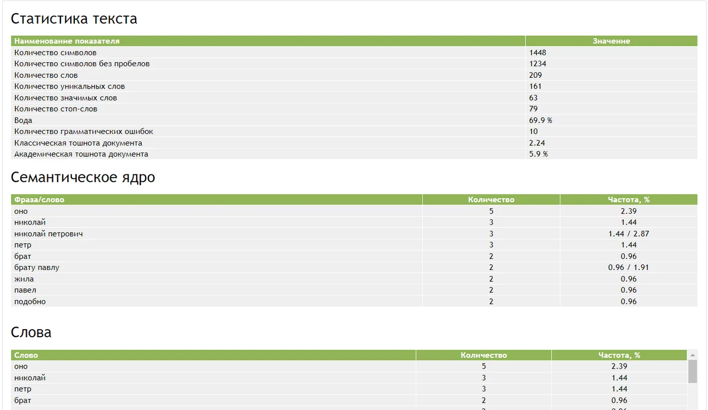 «Адвего» считает различные показатели, такие как тошнота и водность текста, выделяет семантическое ядро, указывает процентное соотношение использованных слов и отмечает стоп-слова. Объем исследуемого текста не должен превышать 100 000 символов.
