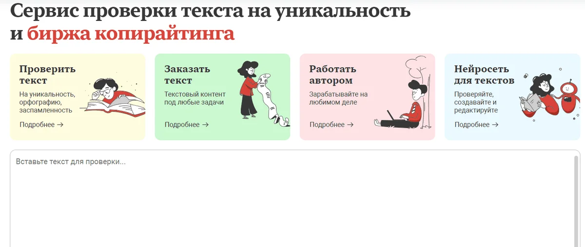 Портал для проверки текстов на антиплагиат. Помимо уникальности, сайт также показывает количество символов, водность текста и заспамленность. После проверки система выдает ссылки на сайты, где встречается идентичный текст, а также подсвечивает фразы и предложения, которые уже были использованы в других материалах.