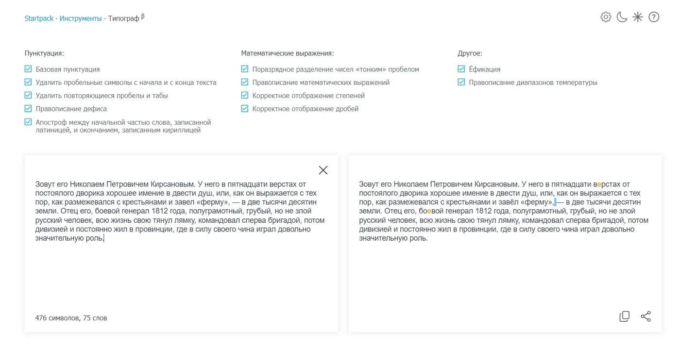 Ресурс для исправления мелких недочетов в тексте. Сервис позволяет почистить пробелы, исправить символы на нужные — например, букву «е» на «ё», если это необходимо — отображает дроби и степени. В работе схож с упомянутым выше «Типографом от Артемия Лебедева», так что можно попробовать оба и выбрать тот, который больше понравится.