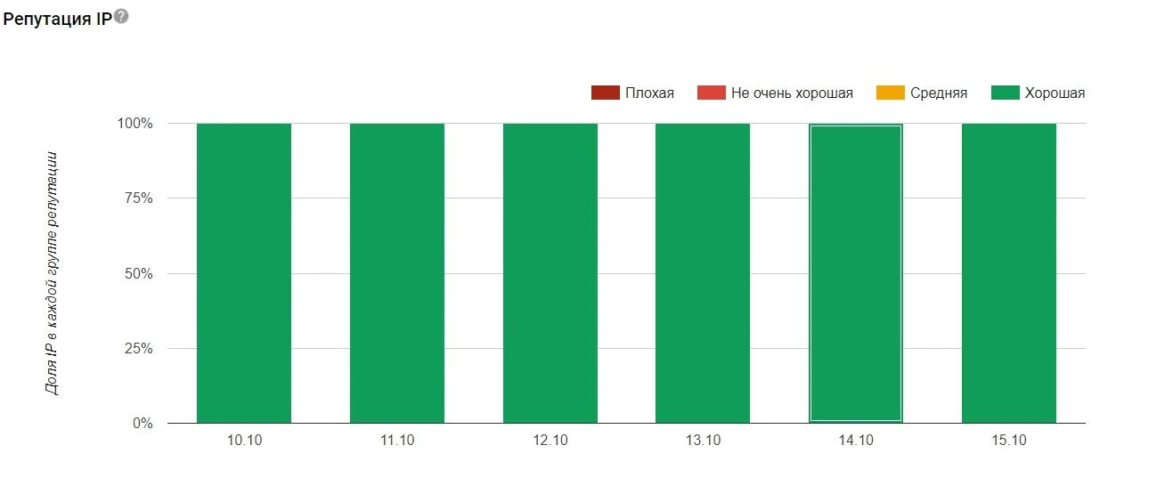 Удобно, что Google разделяет репутацию IP и домена. Можно сразу понять, когда какой-то из показателей снижается. Минус в том, что увидеть статистику могут только те, кто отправляет не менее 200-500 писем в день на ящики Google.
