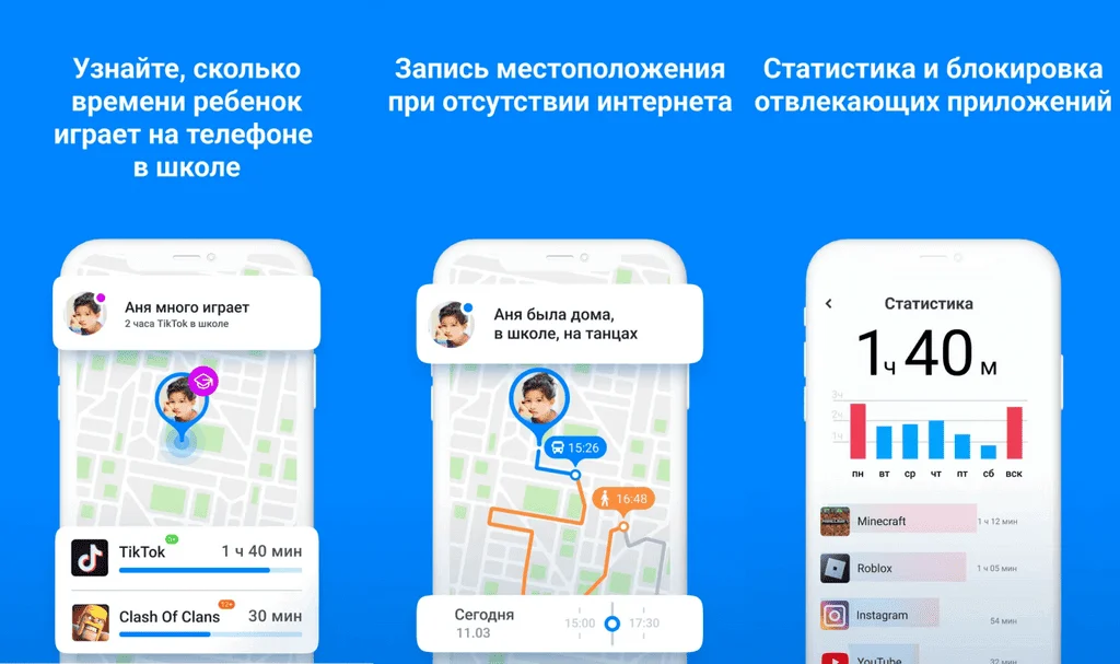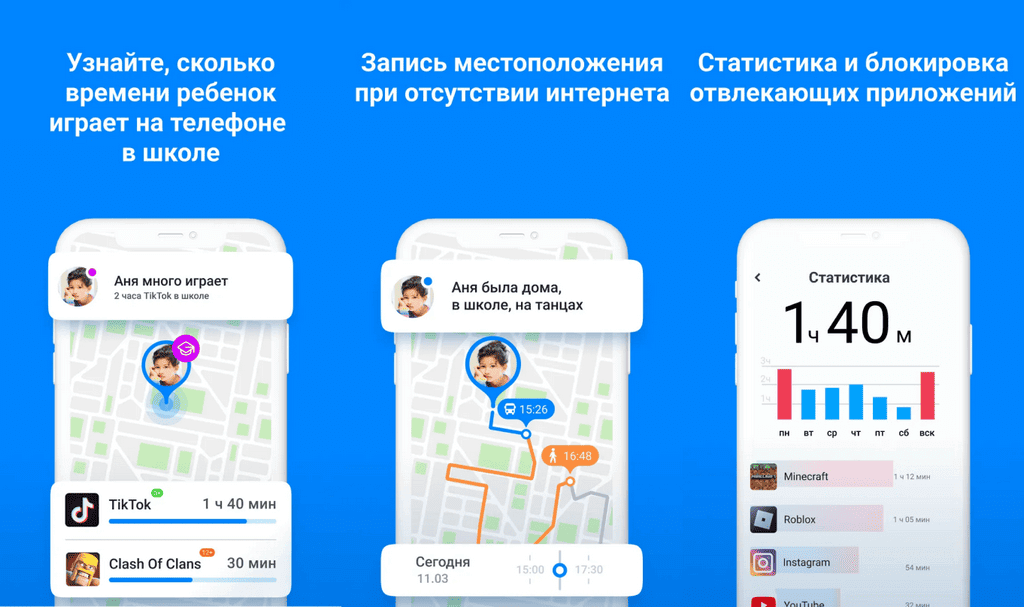 «Где мои дети». Приложение для отслеживания местоположения детей через GPS с помощью смартфонов или смарт-часов. Еще можно смотреть историю его передвижения. Родители могут включать звук вокруг телефона и слышать, что происходит. Если ребенок не отвечает, можно послать специальный сигнал — он сработает, даже если на телефоне включен беззвучный режим. Также можно контролировать экранное время и следить за уровнем заряда на гаджетах ребенка.