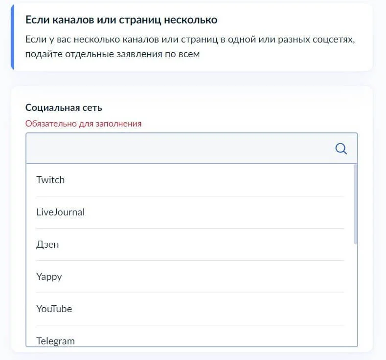 Также из формы регистрации на Госуслугах стало понятно, блоги на каких информационных площадках попадают под действие закона. Это Twitch, LifeJournal, Дзен, Yappy, YouTube, Telegram, Likee, Pinterest, Rutubе, ВКонтакте, Одноклассники, TikTok, Пикабу.