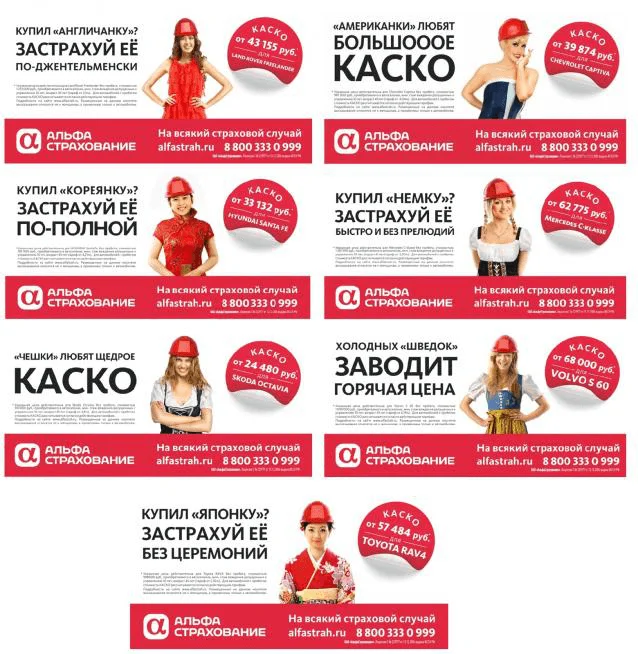Иногда даже банки пытаются привлечь аудиторию эротической рекламой. Например, в 2013 году «Альфа-Страхование» сравнило автомобили с женщинами.