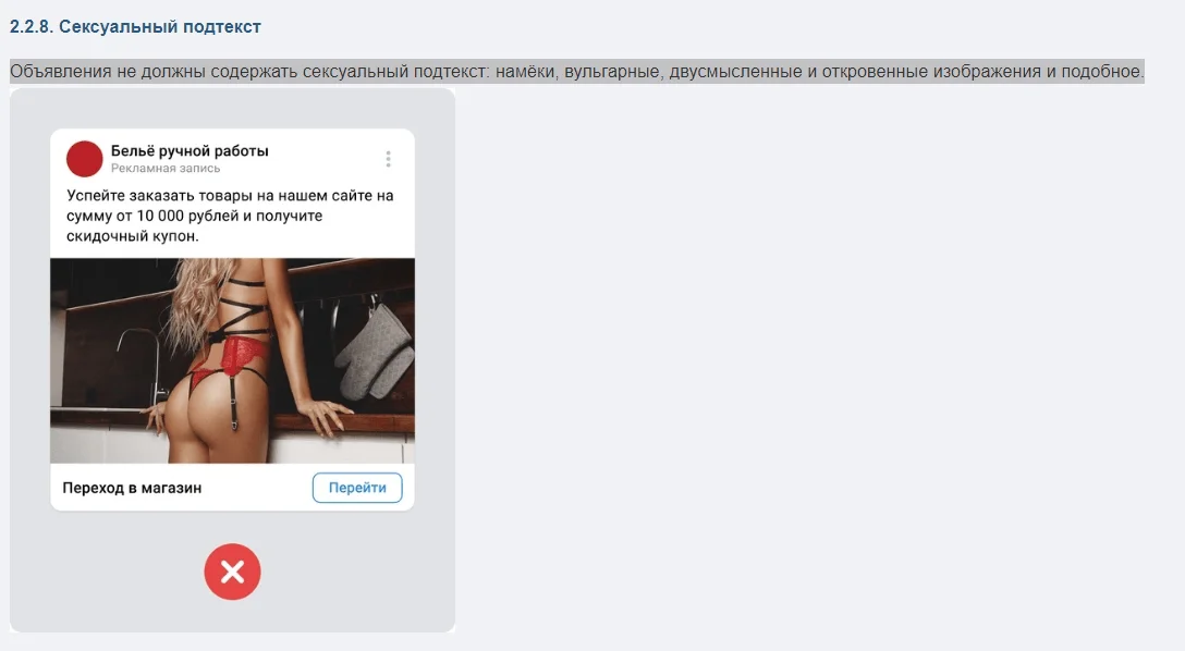 А Facebook*, ВКонтакте, Instagram* и другие социальные сети запрещают использовать слишком сексуальные иллюстрации. Например, в правилах рекламы Вконтакте сказано, что объявления не должны содержать сексуальный подтекст: намёки, вульгарные, двусмысленные и откровенные изображения и подобное.