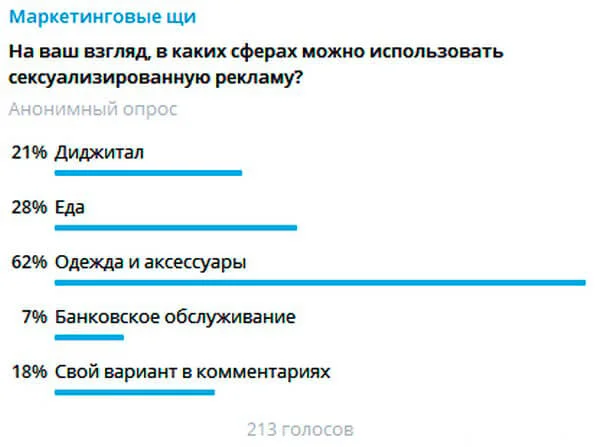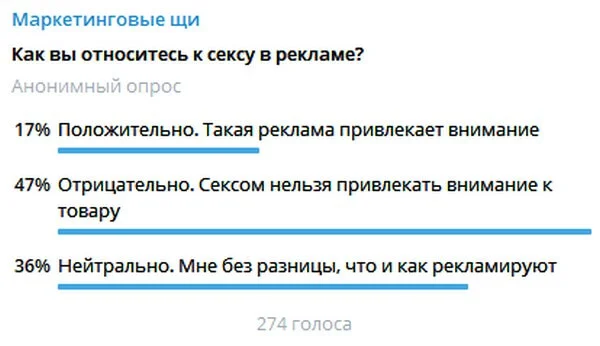 Мы провели своё небольшое исследование и опросили подписчиков нашего Telegram-канала «Маркетинговые щи». Вот что подписчики думают о сексе в рекламе.