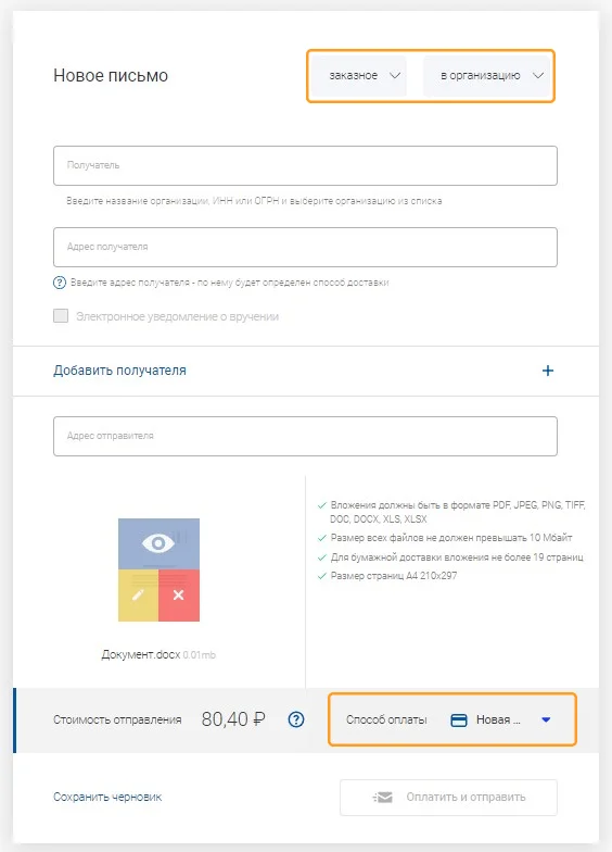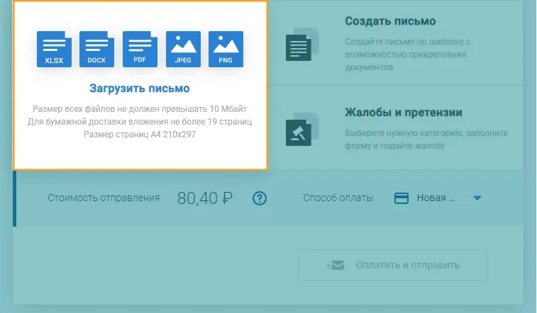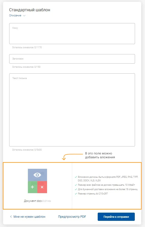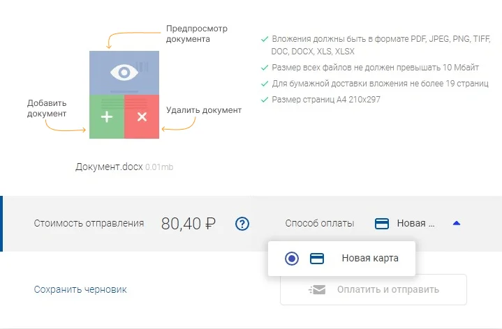 | Отправка письма на 15 ₽ дешевле бумажного | Размер всех файлов — до 10 МБ, а общий объем страниц для бумажной отправки — до 19 |