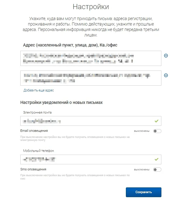Настройка профиля. Здесь указаны адреса пользователя, номер телефона и адрес электронной почты. Можно добавить и удалить адреса, подключить оповещения на телефон или почту.
