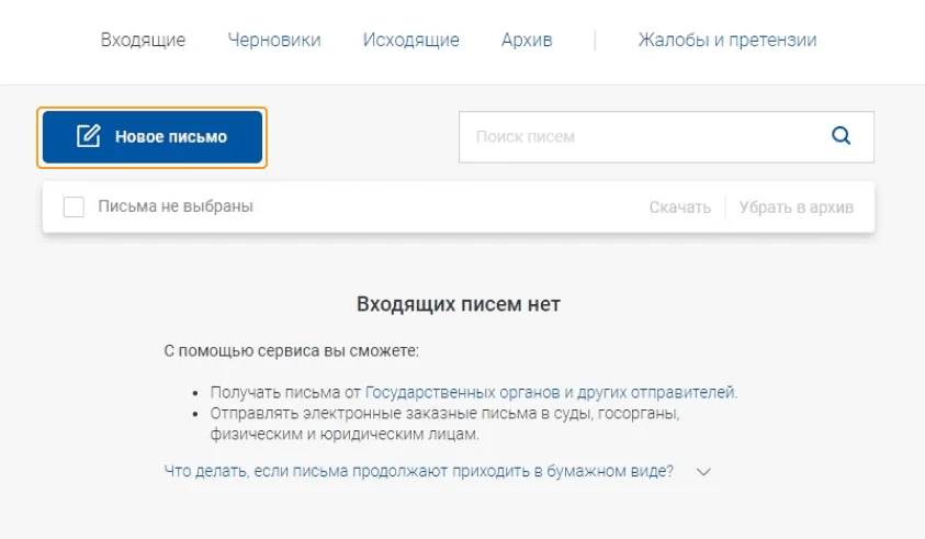 | Получать письма и уведомления от госорганов и юрлиц | За раз можно отправить только 30 писем 30 получателям |