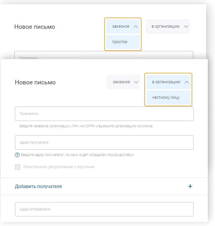Дальше нужно выбрать, кому и какое отправить письмо. Сервис предлагает два варианта: физлицу или в организацию, простое или заказное письмо.