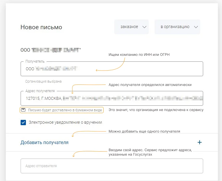 Для примера мы выбрали заказное письмо в организацию. Дальше заполняем поля: находим организацию, вводим адрес получателя и отправителя. Можно поставить галочку, чтобы получить электронное уведомление о вручении за дополнительную цену.