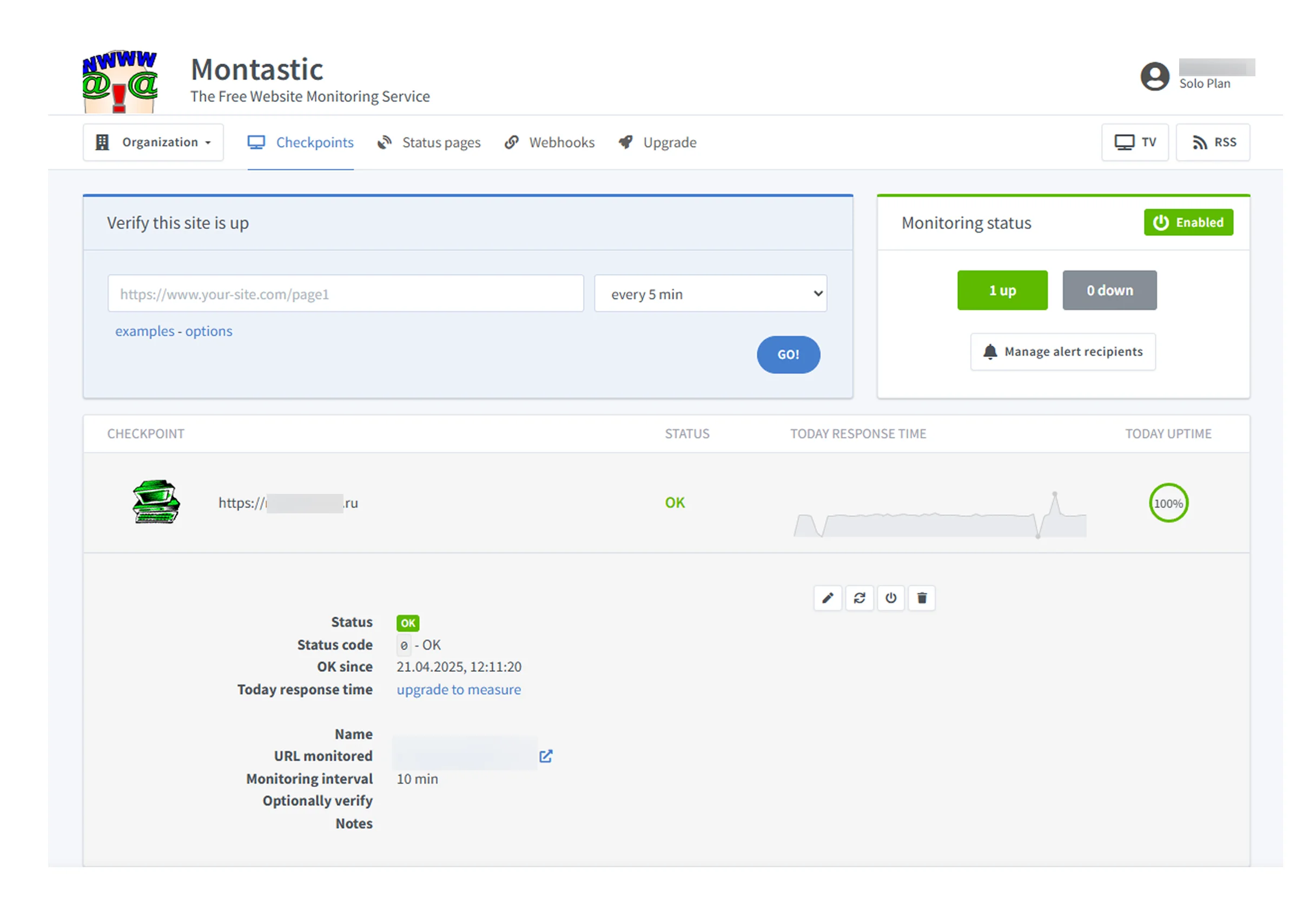 Что мониторит: ответ отклика сайта, время загрузки страницы, ответ от DNS, срок регистрации домена, действительность SSL-сертификата, наличие вирусов, доступность FTR.