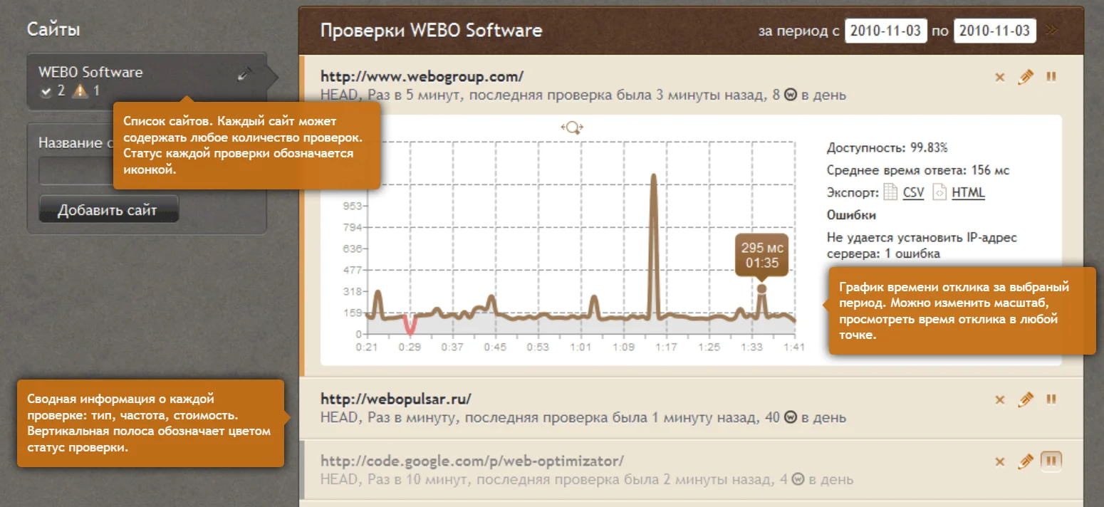 При обнаружении проблемы владелец сразу же получает оповещение. Также ежедневно сервис формирует отчёт с показателями производительности.