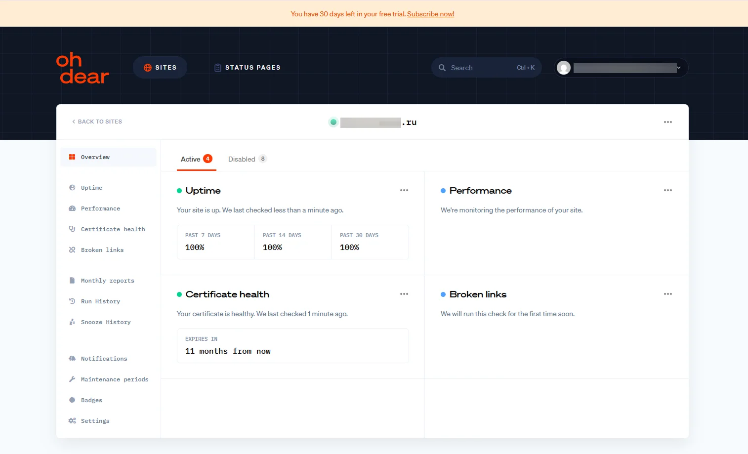 Что мониторит: доступность и страницы сайта, время отклика и длительность инцидентов, сертификаты SSL, срок регистрации доменного имени.