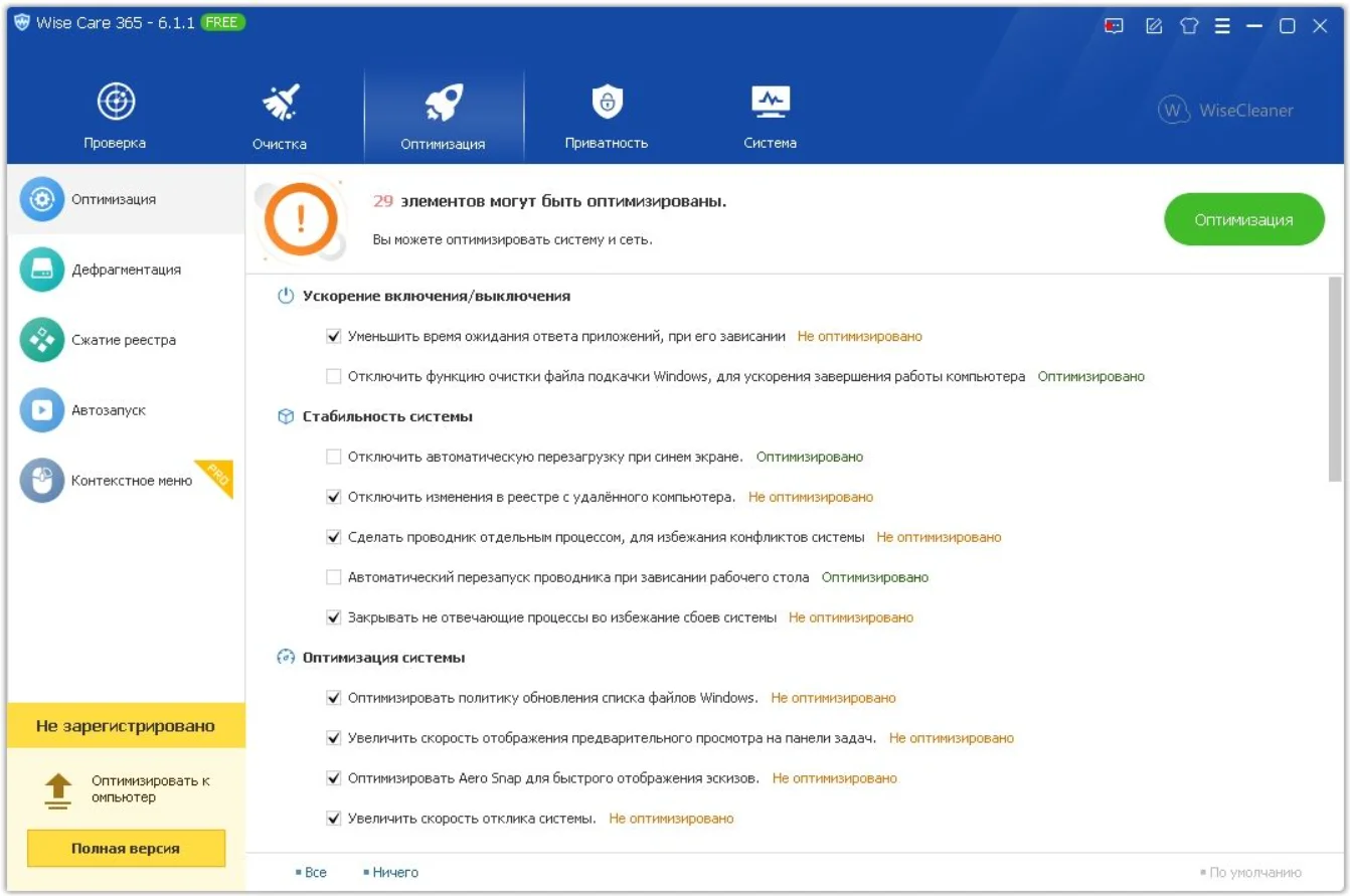 Wise Care 365 V6 используют для оптимизации, настройки и очистки компьютера. Особенность программы — в автоматической оптимизации за один клик. Можно настроить проверку системы по заданному расписанию.